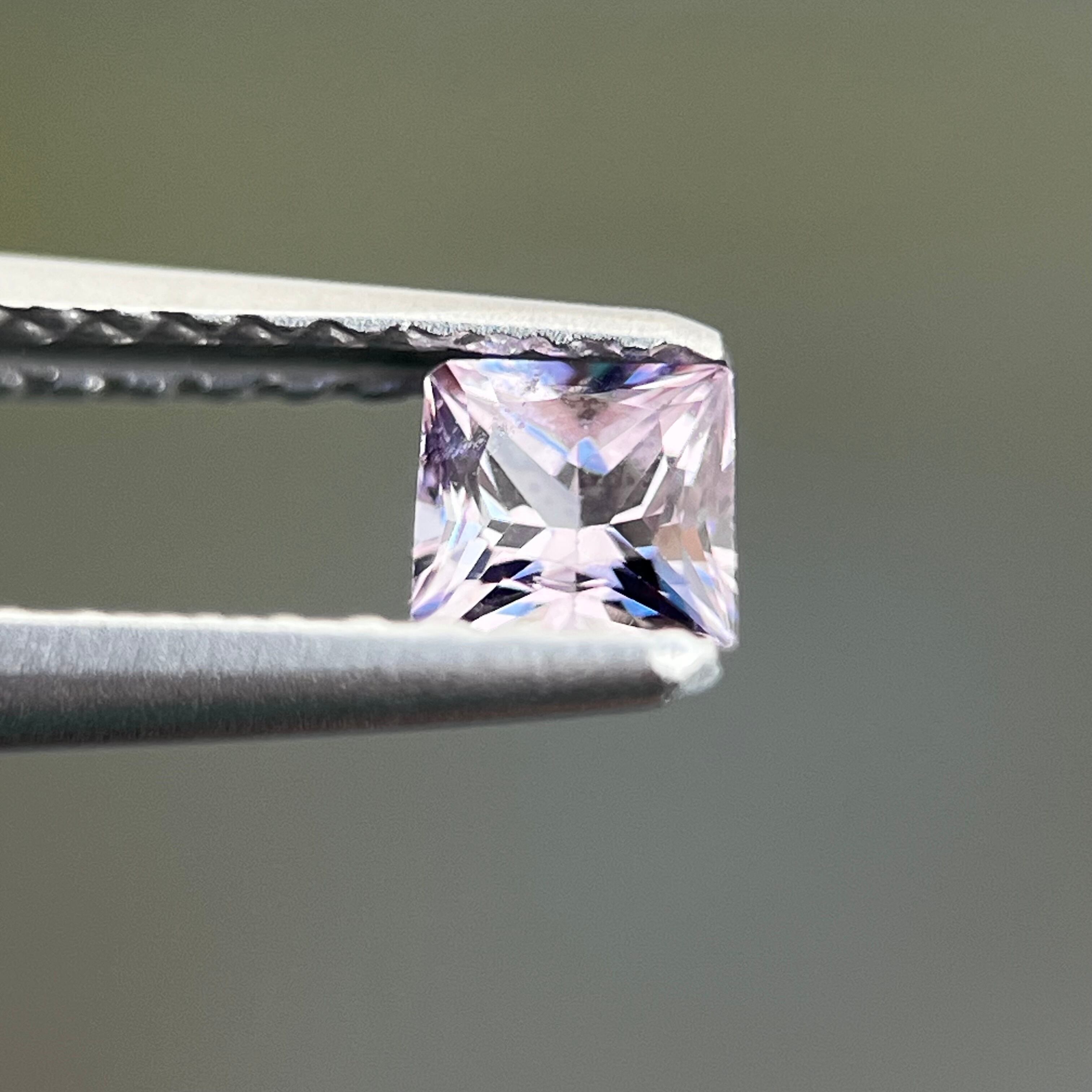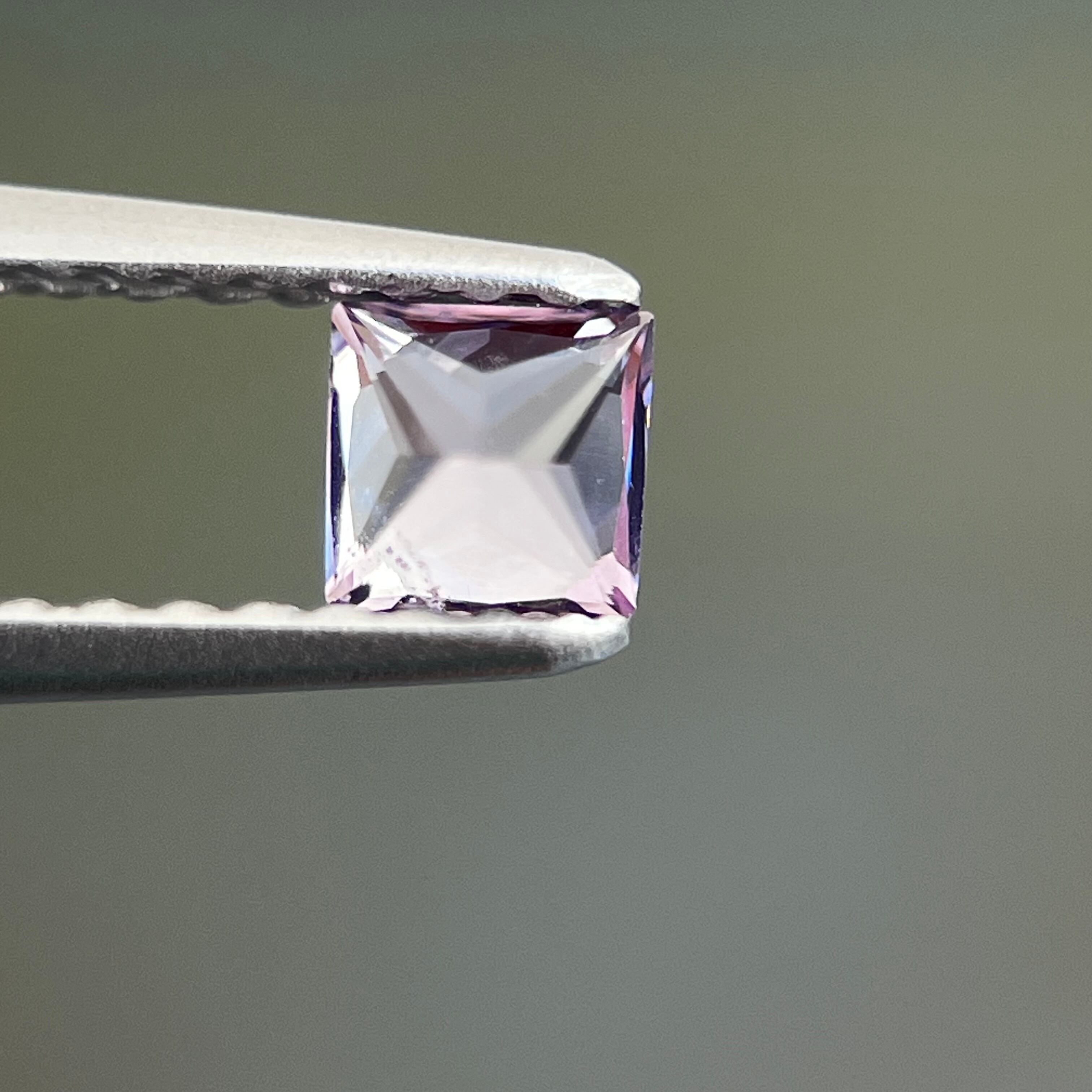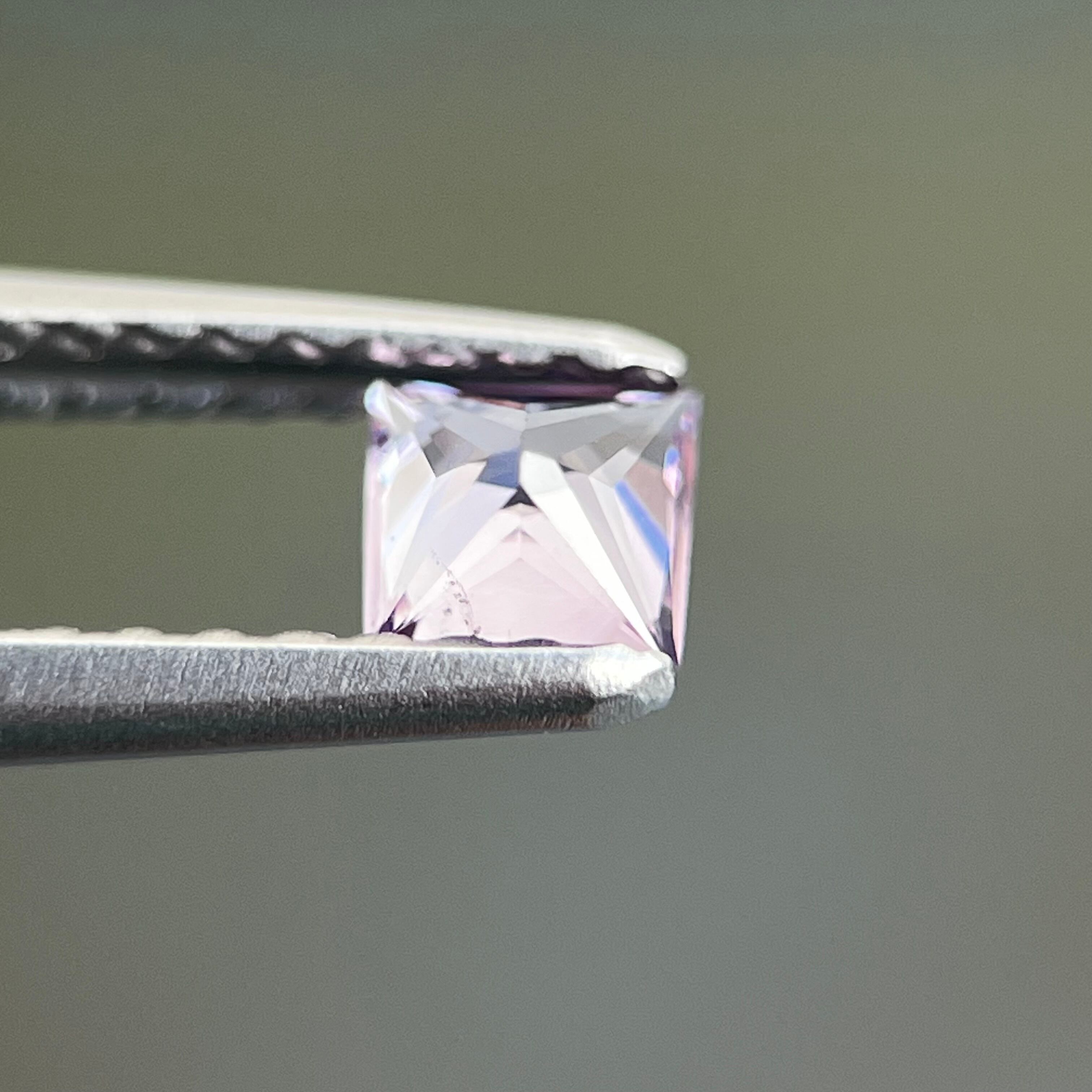 プリンセスカットで、実物肉眼で見るととても綺麗なルースです。iPhone でマクロレンズ使用して室外で撮影した画像です。