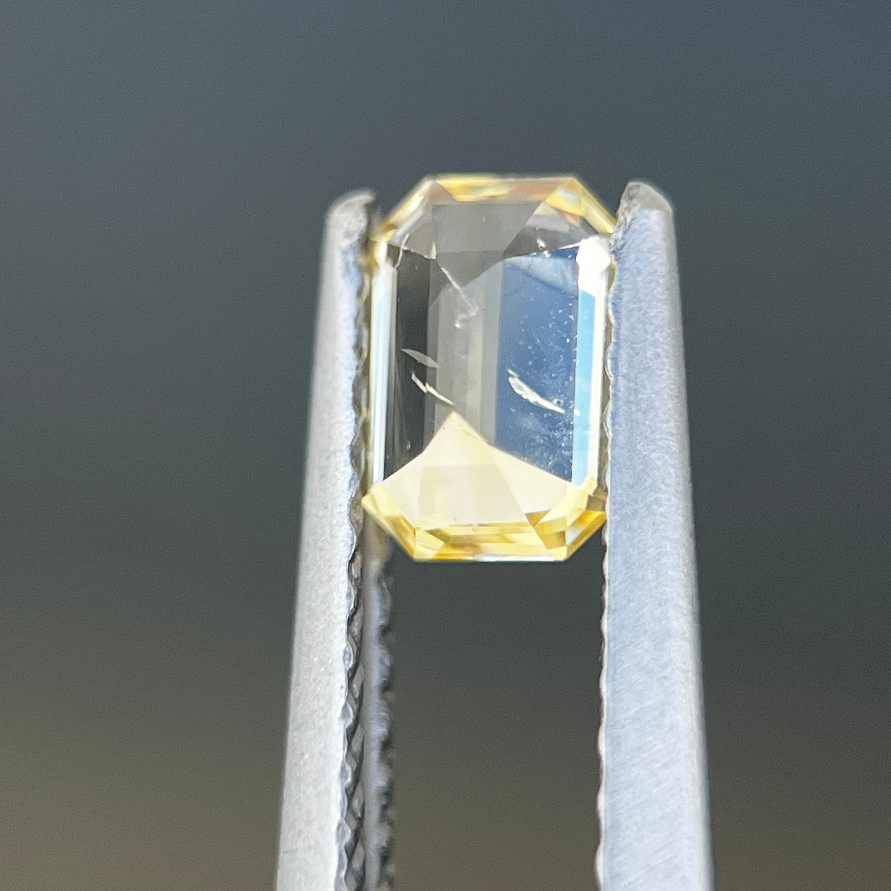 エメラルドカットが光をシャープに反射し、